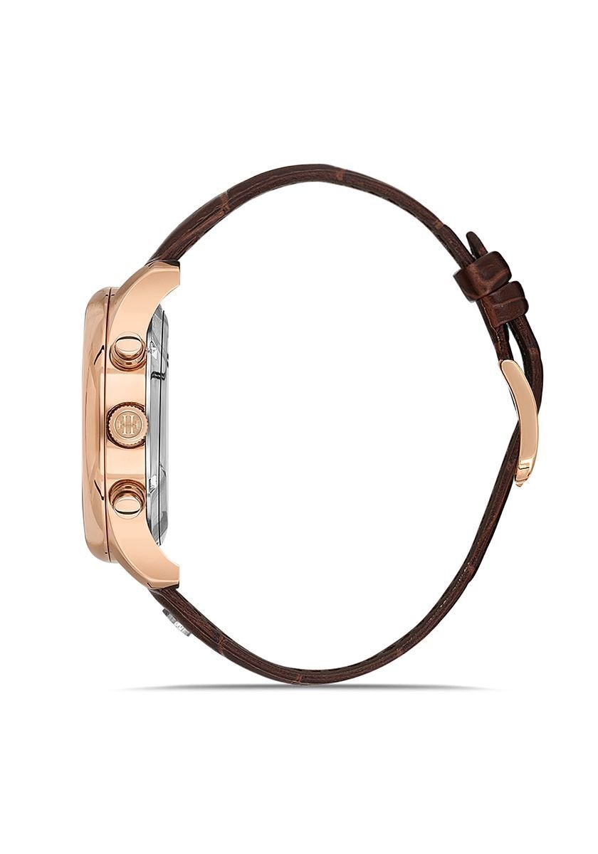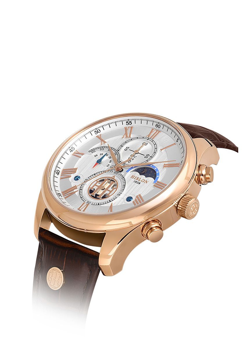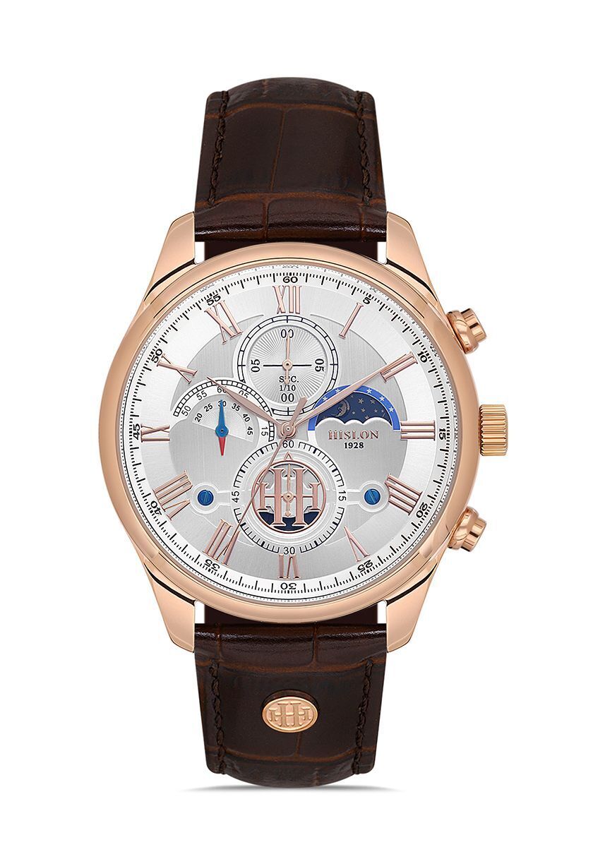 Hislon Men's Timeles's TM113R-02KR, Erkek Kol Saati Çalışma Şekli: Quartz, Makine Modeli: Japon Seiko VD59, Kasa Materyali: 316L Paslanmaz Çelik, Kasa Şekli: Yuvarlak, Kasa Çapı: 44 mm, Kasa Kalınlığı: 12.8 mm, Kasa Rengi: Rose Gold, Kadran Rengi: Beyaz, Cam Cinsi: Safir Kaplama, Cam Şekli: Düz, Kordon Tipi: 316L Paslanmaz Çelik, Kordon Rengi: Kahverengi, Kordon Kilidi: Standart Tokalı, Kordon Genişliği: 22 mm, Su Geçirmezlik: 10 ATM, Çift Zaman Dilimi: Yok, Kronometre: Yok, 12/24 Göstergesi: Yok, Takvim: Ay Pozisyonu, Alarm: Yok