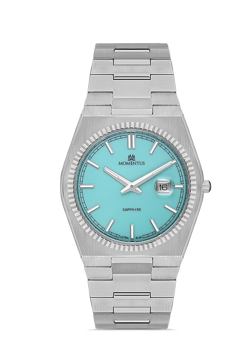 Momentus Men's Elegance EM346S-10SS, Erkek Kol Saati Çalışma Şekli: Quartz, Makine Modeli: Japon Miyota 9U15, Kasa Materyali: 316L Paslanmaz Çelik, Kasa Şekli: Yuvarlak, Kasa Çapı: 40 mm, Kasa Kalınlığı: 5.45 mm, Kasa Rengi: Çelik, Kadran Rengi: Turkuaz, Cam Cinsi: Safir, Cam Şekli: Düz, Kordon Tipi: 316L Paslanmaz Çelik, Kordon Rengi: Çelik, Kordon Kilidi: Kelebek Klips, Kordon Genişliği: 27 mm, Su Geçirmezlik: 3 ATM, Çift Zaman Dilimi: Yok, Kronometre: Yok, 12/24 Göstergesi: Yok, Takvim: Tarih, Alarm: Yok