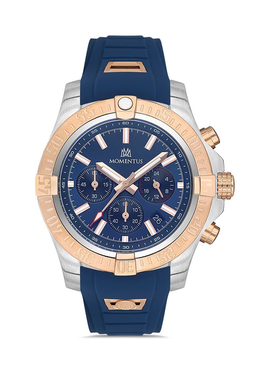 Momentus Men's Sport Master SM365T-11MR, Erkek Kol Saati Çalışma Şekli: Quartz, Makine Modeli: Japon Seiko VD53, Kasa Materyali: 316L Paslanmaz Çelik, Kasa Şekli: Yuvarlak, Kasa Çapı: 44 mm, Kasa Kalınlığı: 12 mm, Kasa Rengi: Çelik - Rose Gold, Kadran Rengi: Lacivert, Cam Cinsi: Mineral, Cam Şekli: Düz, Kordon Tipi: Silikon, Kordon Rengi: Lacivert, Kordon Kilidi: Kilitli Klips, Kordon Genişliği: 22 mm, Su Geçirmezlik: 10 ATM, Çift Zaman Dilimi: Yok, Kronometre: Var, 12/24 Göstergesi: Var, Takvim: Tarih, Alarm: Yok