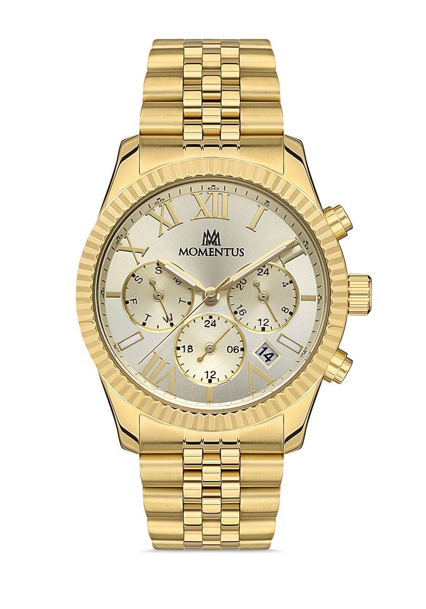 Momentus Women's Classy CW128G-08SG, Kadın Kol Saati Çalışma Şekli: Quartz, Makine Modeli: Japon Miyota JP25, Kasa Materyali: 316L Paslanmaz Çelik, Kasa Şekli: Yuvarlak, Kasa Çapı: 38 mm, Kasa Kalınlığı: 10.1 mm, Kasa Rengi: Gold, Kadran Rengi: Gold, Cam Cinsi: Mineral, Cam Şekli: Düz, Kordon Tipi: 316L Paslanmaz Çelik, Kordon Rengi: Gold, Kordon Kilidi: Kilitli Klips, Kordon Genişliği: 20 mm, Su Geçirmezlik: 5 ATM, Çift Zaman Dilimi: Var, Kronometre: Yok, 12/24 Göstergesi: Var, Takvim: Tarih & Gün, Alarm: Yok